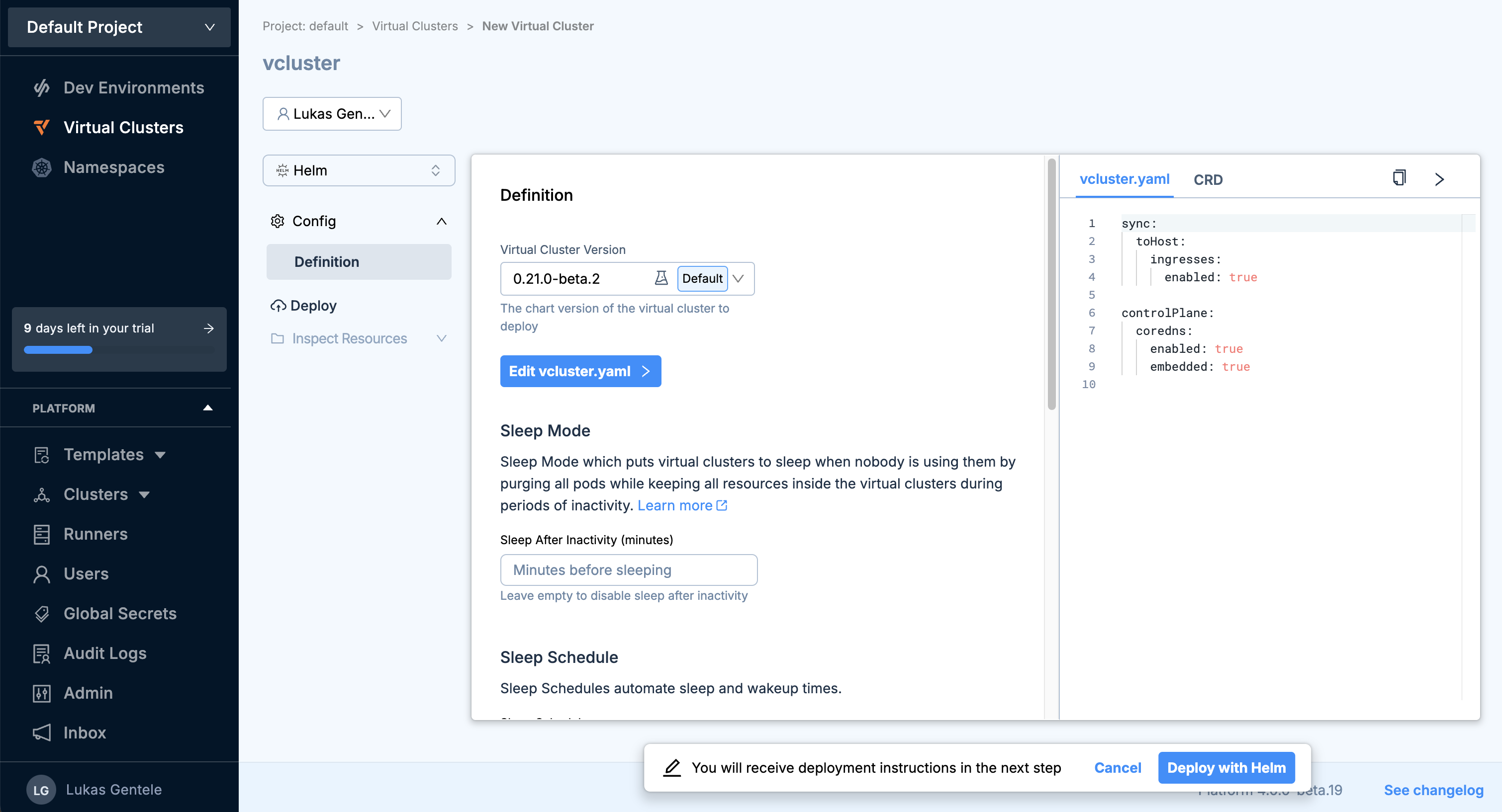 The Platform now requires you to set a vCluster version when creating a virtual cluster. Previously the version field could be empty and would auto-populate with the Platform’s default value. Now, the field will be prefilled in the UI but a value is required to be saved in the virtual cluster configuration making the versions each virtual cluster runs with more explicit and easier to manage over time.
